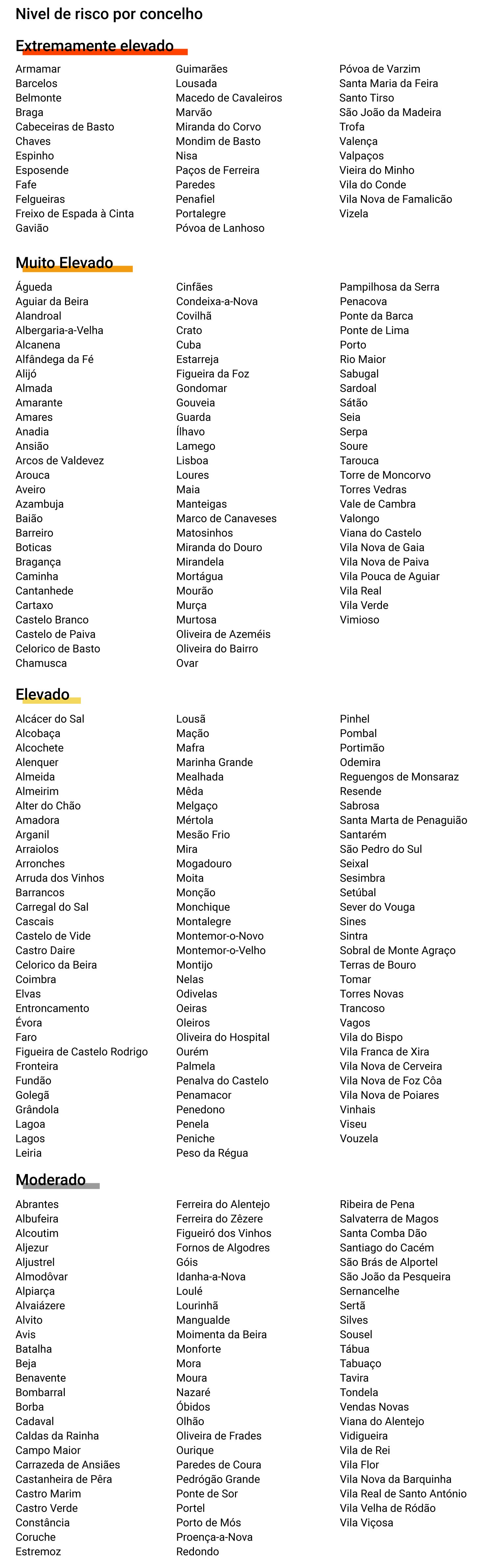 A proibição não se aplica: Estas datas incluem a noite de halloween e o dia de todos os santos. De notar que, no natal, não se aplicará qualquer proibição de circulação entre concelhos e a proibição de circulação na via pública só se aplicará a partir das 2h00, nos dias 24 e 25. Limitação da circulação de pessoas entre concelhos entre os dias 27 de novembro e 2 de dezembro e entre os dias 4 de dezembro e 8 de dezembro. O novo estado de emergência prevê, no fim de semana, a proibição de circulação entre concelhos em todo o país e o recolher obrigatório para todos os concelhos com nível de risco elevado ou superior.